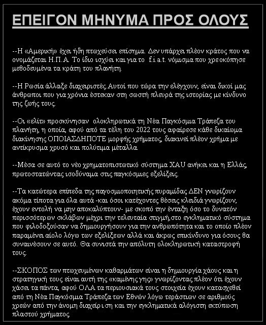 Μην πιστεύετε σε προσχεδιασμένα σενάρια. Απομακρυνθείτε από τα επίσημα αφηγήματα των καθαρμάτων που παίζουν τα τελευταία τους χαρτιά και -εκτός της απροκάλυπτης βίας- χωρίς ουσιαστικούς άσσους πλέον στο μανίκι τους... Κάθε τους κίνηση μπορεί να έχει στόχο το ηθικό μας (και τα καταφέρνουν να το κλονίζουν σε τακτική βάση) αλλά παράλληλα προσθέτει από ένα επιπλέον καρφί στο φέρετρο της παγκοσμιοποιητικής συμμορίας που πνέει τα λοίσθια...